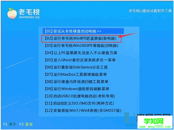首先準(zhǔn)備一個U盤,然后制作好U盤啟動盤。(制作方法跟方法一里面介紹的一樣)U盤啟動盤制作好后從網(wǎng)上下載win7、win8的iso系統(tǒng)鏡像文件并保存到U盤中,將制作好的老毛桃U盤插入電腦USB接口中,啟動電腦,按相應(yīng)的電腦啟動快捷鍵進(jìn)入老毛桃主菜單,用鍵盤上的方向鍵 切換到【02】運(yùn)行老毛桃Win8PE防藍(lán)屏版(新電腦)