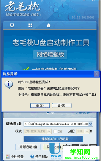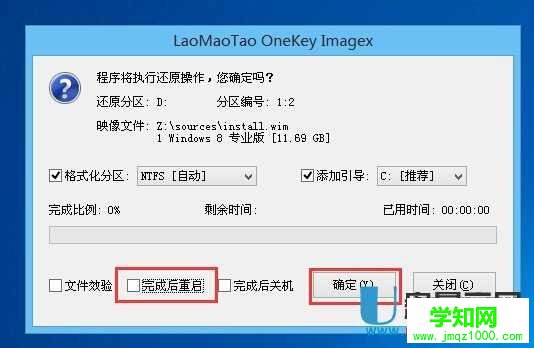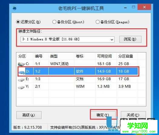 運(yùn)行 老毛桃PE一鍵裝機(jī) 工具后,該軟件會自動識別ISO鏡像文件(即剛才我們下載復(fù)制到U盤GHO文件夾里面的那個ISO鏡像包),并自動提取里面的GHO文件。我們只需點擊 確定(Y) 按鈕即可!