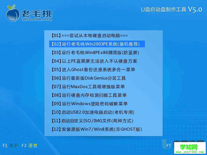 當(dāng)進(jìn)入到老毛桃啟動u盤主界面的時候,我們按上下方向鍵將光標(biāo)選擇到 【02】 運(yùn)行老毛桃Win2003PE增強(qiáng)版(裝機(jī)推薦) 后,按下回車鍵進(jìn)入;