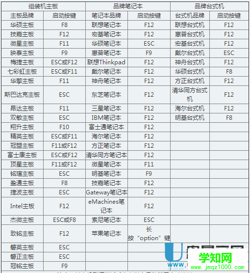 下面小編列出各種品牌的一鍵啟動u盤的快捷鍵查詢表: