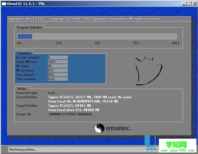 接下來會出現(xiàn)一個正在解壓GHO的窗口,該窗口有進(jìn)度條,此時我們無需做任何操作,只需耐心等待其完成即可