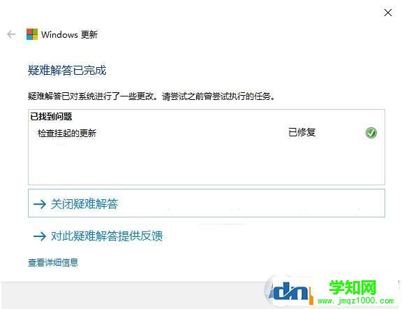 系統(tǒng)被檢測(cè)到有掛起的更新。選擇“應(yīng)用此修補(bǔ)程序”,就會(huì)自動(dòng)下載安裝被掛起的更新。安裝完成后會(huì)再次自動(dòng)檢測(cè),最后提示“疑難解答已完成”,并顯示完成的修復(fù)操作。如圖: