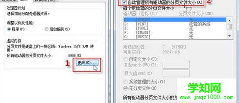 STEP2:在“性能選項(xiàng)”對(duì)話框“高級(jí)”標(biāo)簽項(xiàng)下,單擊“更改”按鈕;打開虛擬內(nèi)存設(shè)置對(duì)話框后,先取消最上方“自動(dòng)管理所有驅(qū)動(dòng)器的分頁(yè)文件大小”一項(xiàng),如圖2所示。