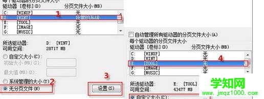 STEP3:接下來(lái)就是進(jìn)入重要的手動(dòng)調(diào)整步驟了。一共分六步進(jìn)行:選定win7所在分區(qū)→選中“無(wú)分頁(yè)文件”一項(xiàng)→單擊“設(shè)置”按鈕→再選定要將虛擬內(nèi)存轉(zhuǎn)移到的目標(biāo)分區(qū)(非系統(tǒng)分區(qū))→按照物理內(nèi)存大小設(shè)置虛擬內(nèi)存值→單擊“設(shè)置”完成,如圖3所示。