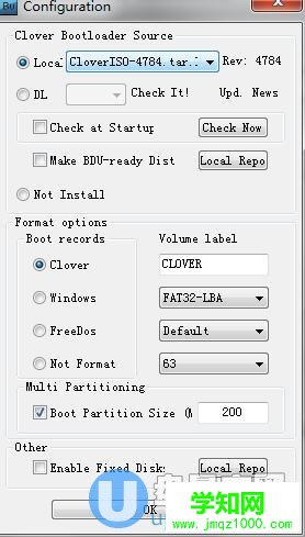 2、點(diǎn)擊工具上方的options,在local位置選擇我們的cloveriso文件,我們U盤(pán)網(wǎng)這里提供的BootDiskUtility工具里面是自帶有這個(gè)iso的,否則你根本無(wú)法下載到這個(gè)iso,所以很多人無(wú)法使用這個(gè)工具成功,而我們這里已經(jīng)提供了就沒(méi)有這個(gè)問(wèn)題,按下圖設(shè)置好后點(diǎn)ok。