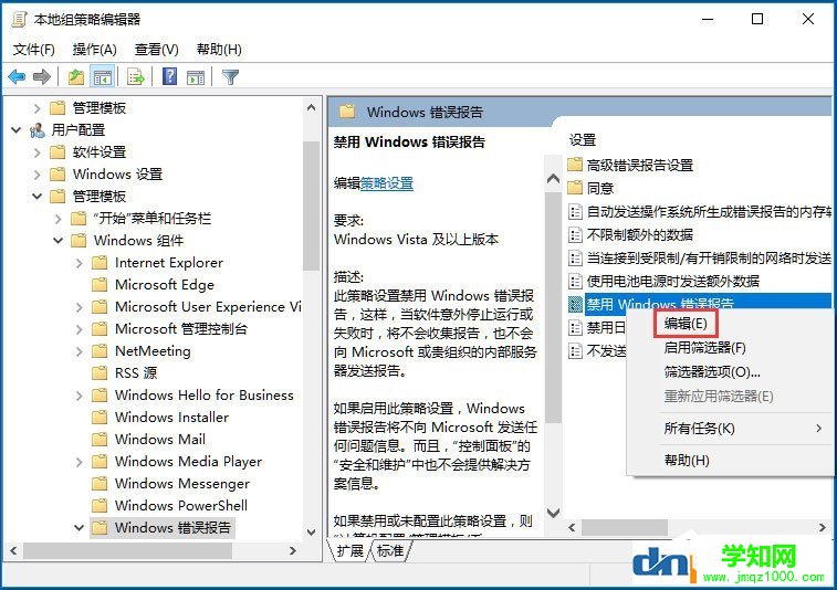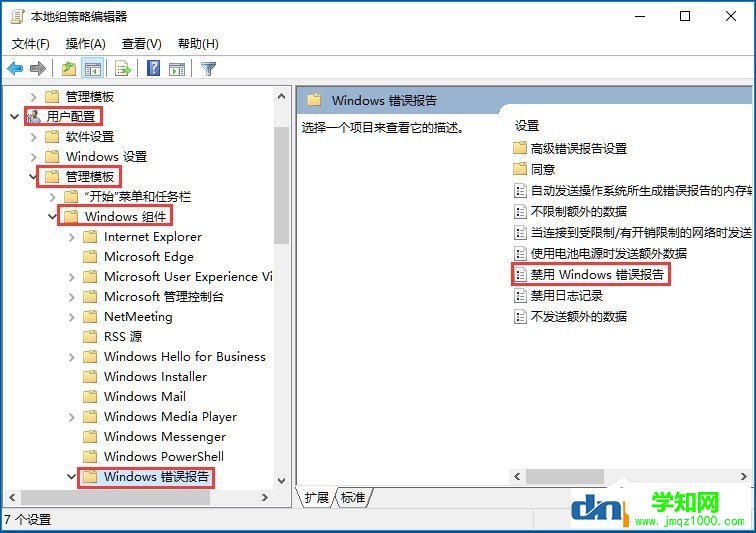 3、打開(kāi)用戶配置→ 管理模板→Windows組件→Windows錯(cuò)誤報(bào)告→禁用Windows錯(cuò)誤報(bào)告;