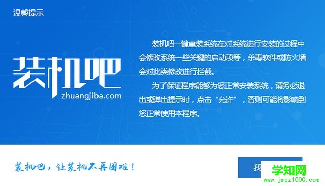 1、下載裝機(jī)吧一鍵重裝系統(tǒng)軟件,點擊網(wǎng)頁上方的立即下載,等待下載完成后雙擊打開,根據(jù)提示退出殺毒軟件