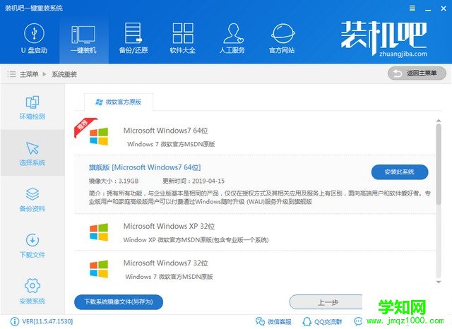 4、選擇需要安裝的win7系統(tǒng),裝機(jī)吧提供的是微軟官方原版win7系統(tǒng)哦
