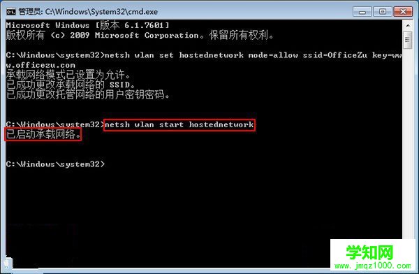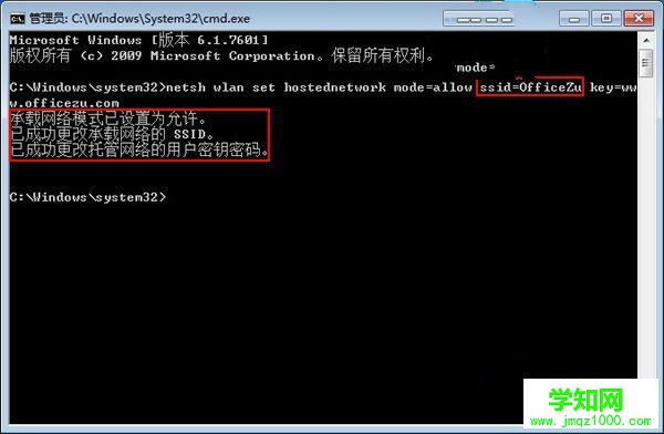 打開“命令字符框”輸入“netsh wlan set hostednetwork mode=allow ssid=OfficeZu key=www.html' target='_blank'>officezu.com”再按“回車鍵”出現“承載網絡模式已設置為允許”。(ssid=無線網絡名稱,key=無線網絡密碼用戶可以自行更改)