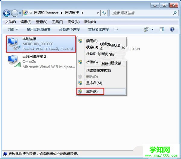 此時點擊“本地連接”按鼠標右鍵選擇“屬性”。