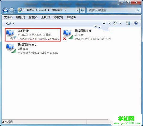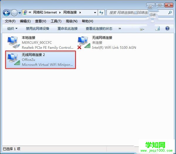 用戶可以看到“網絡連接”內有一個“Microsoft Virtual WiFi Miniport Adapter”設備。(這個就是用戶剛才在“命令字符”框中輸入的命令搭建的無線網絡)