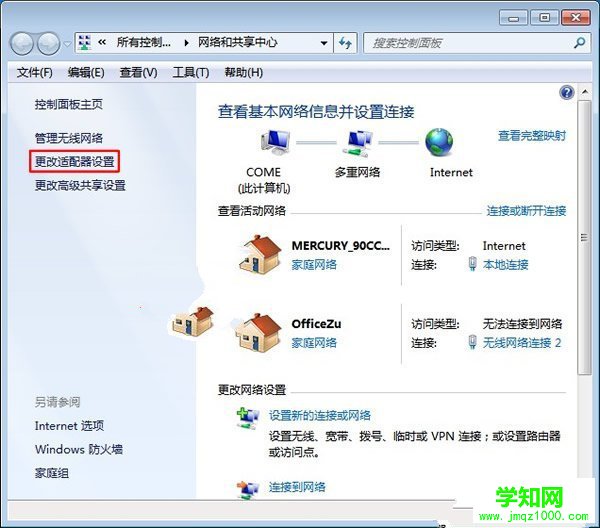 打開“網絡和共享中心”點擊左邊的“更改適配器設置”。