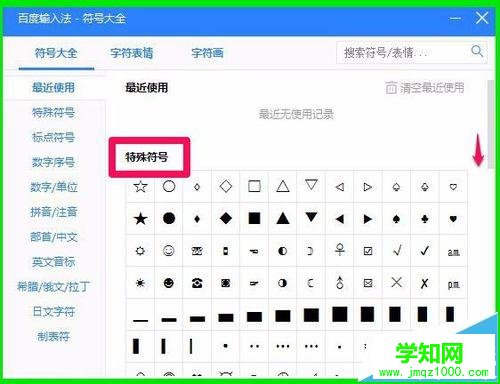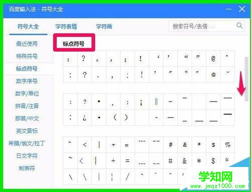 4、用鼠標左鍵按住窗口右側的小滑塊向下拖動,還有【標點符號】、【數字符號】、【數字/單位】、【拼音注音】、【部首/中文】、【英文音標】、【希臘/俄文/拉丁】、【日文字符】及【制表符】等。