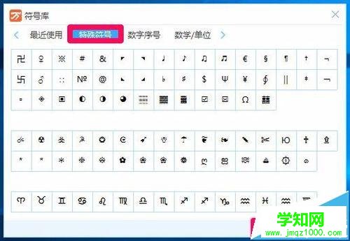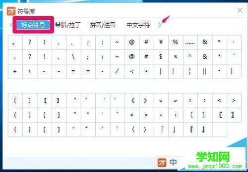 5、在符號庫中點擊“〉”符號還可以找到【數字序號】、【數字/單位】、【標點符號】、【希臘/拉丁】、【拼音注音】、【中文字符】、【英文音標】、【日文平假名】、【日文片假名】、【俄文字符】及【制表符】等;