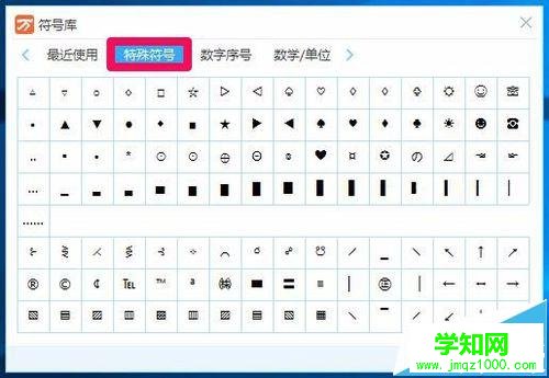 4、點擊符號庫以后,就可以看到特殊符號,在特殊符號下點擊就可以輸入需要的特殊符號。如®、▲、▶、◀等,還可以點擊下一頁,輸入特殊符號,如:Ω、囍、卍、卐等;