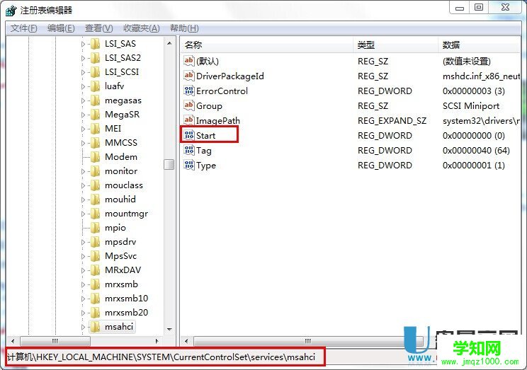 2.打開注冊表編輯器,依次打開注冊表,找到HKEY_LOCAL_MACHINE/System/CurrentControlSet/Services/Msahci下的 start 。如下圖所示