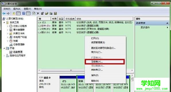 第三步、通過判斷,我們右鍵點擊空間比較多磁盤分區 ,選中“壓縮卷”。