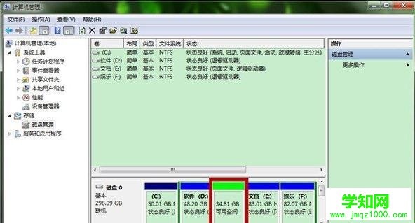 第六步、完成壓縮后,“磁盤管理”中會多一個“可用空間”。