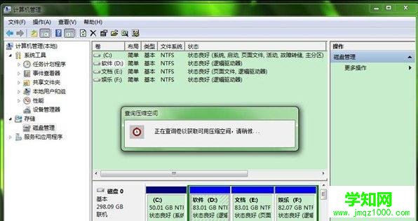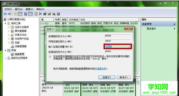 第五步、系統會彈出“壓縮”窗口,可輸入部分默認的是:可壓縮容量。我們可以輸入想獲得以M為單位的磁盤容量,多少可以自定,注意1G=1024M,然后再點擊“壓縮”。