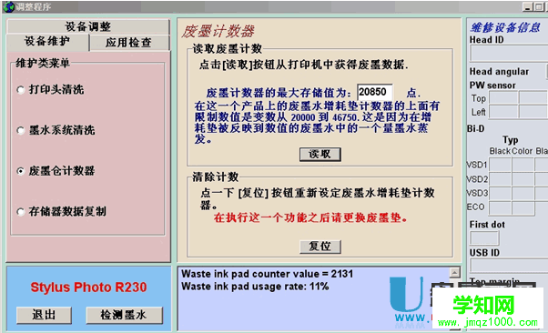 選擇廢墨倉計數器,點擊讀取就可以在最下面的信息窗口看到您的打印機廢墨數值了!