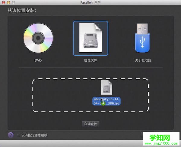 3、Parallels Desktop將自動查找本機上的系統鏡像,若未找到可通過手動查找,直接拖動鏡像到虛線框中,點擊“繼續”進入下一步。