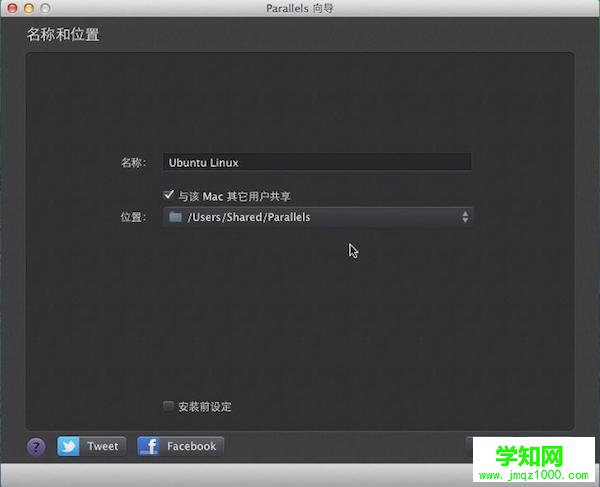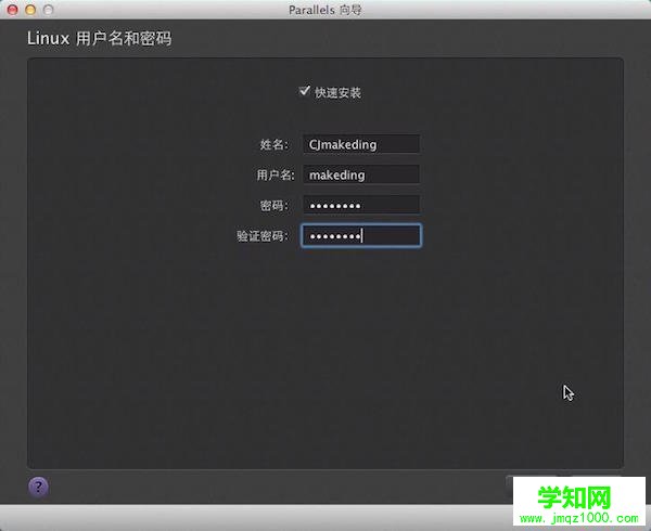 4、設定安裝的linux的用戶名和密碼,密碼需8位以上。點擊“繼續”進入下一步。設定虛擬機的名稱及位置,若要安裝多臺虛擬機,可設定“與該Mac其他用戶共享”。勾選“安裝前設定”可配置虛擬機的各種參數(安裝完可修改設定),也可以使用默認配置。