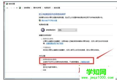3、打開“更改電源按鈕”選擇項后,你會發現“啟用快速啟動(推薦)”這一項是打了√的,并且是灰色的無法修改;