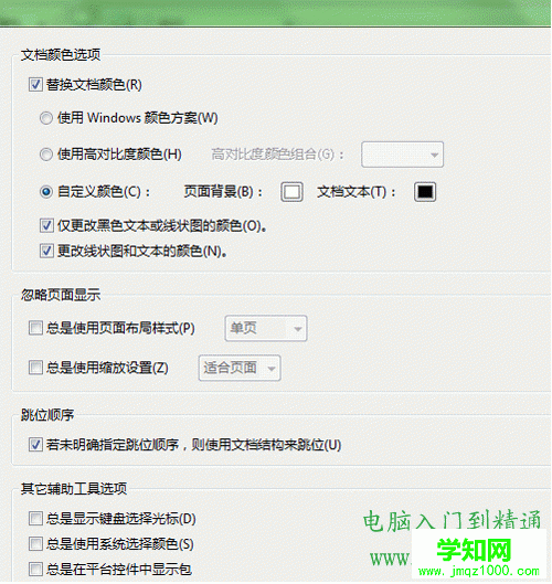 點擊 編輯 ——首選項——輔助工具——選中“替換文檔顏色”和“ 自定義顏色”——將背景顏色改成你想要的背景顏色。