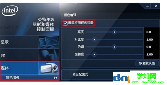 4、選擇“媒體”項,勾選“覆蓋html' target='_blank'>應用程序設置”,可設置屏幕的亮度、對比度、色調、飽和度;