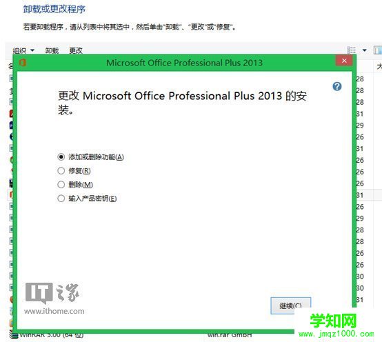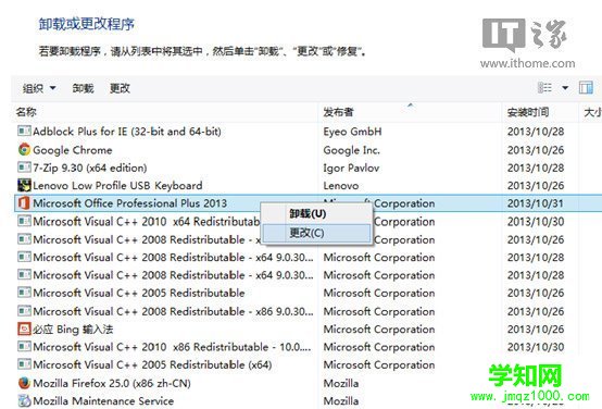 打開控制面板中的“程序和功能項”,進入“卸載程序”,找到Office2013套件安裝項目,例如Microsoft Office Professional Plus 2013,右擊,選擇“更改"