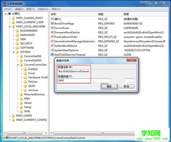 雙擊“WaitToKillServiceTimeOut”將其“數值數據”改為“5000”單擊“確定”即可。(Windows7默認數值是12000代表12秒)