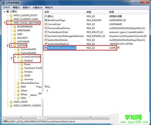 定位到“HKEY_LOCAL_MacHINE/SYSTEM/CurrentControlSet/Control”項目中的“WaitToKillServiceTimeOut”。