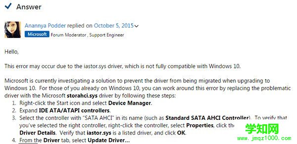 一位微軟工程師Anannya Podder在微軟社區表示,該問題是由名為iastor.sys的驅動程序兼容問題引起的,微軟正在對此進行修復。受影響的用戶可通過暫時使用微軟的storahci.sys驅動來避免藍屏發生。操作方法很簡單,在“設備管理器”中將“IDE ATA/ATAPI 控制器”驅動手動更換為“標準 SATA AHCI
