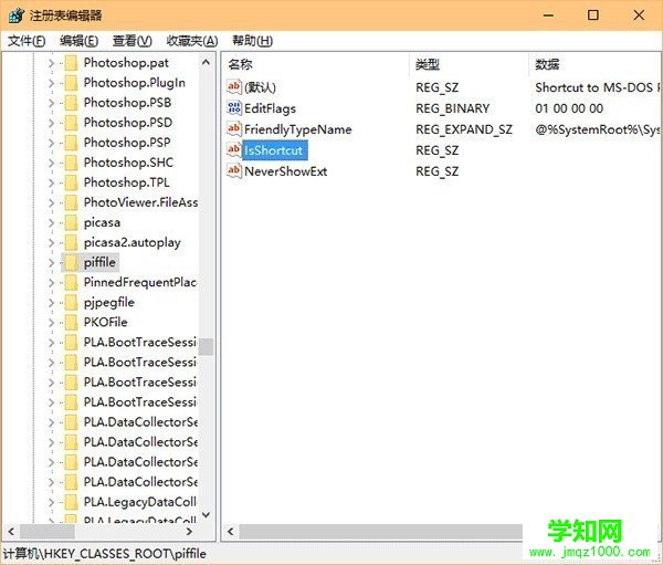 3、再定位到 HKEY_CLASSES_ROOTpiffile,按照第二步的方法再建一個字符串值,仍命名為 IsShortcut,如下圖——