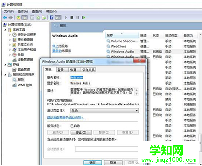 4、注意對html' target='_blank'>Win7系統的聲響效勞禁用情況細節查看,操作方法是先用鼠標右鍵點擊開始菜單中的計算機選項,選中辦理之后就來到了效勞選項,使Windows Audio選項始終處于堅持發動的狀態。