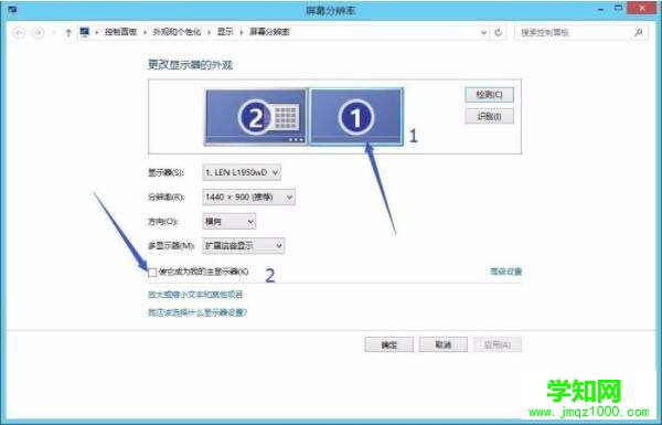 2、在 更改顯示器外觀 欄中選擇需要設置為主屏幕的屏幕編號,選中 使它成為我的主顯示器 ,點擊確定;如圖所示:
