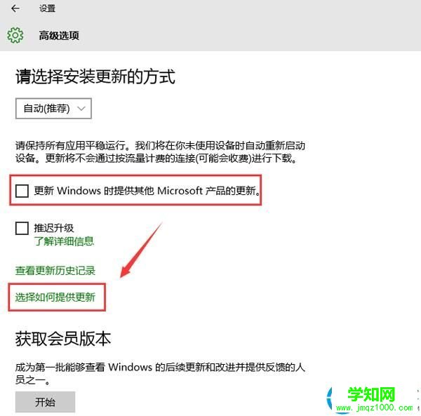 3、接著先取消勾選“更新windows時提供其他microsoft產品的更新”,再點擊“選擇如何提供更新”,如圖所示: