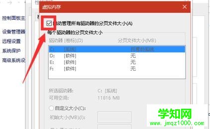 進(jìn)入虛擬內(nèi)存窗口后,把自動(dòng)管理所有驅(qū)動(dòng)器的分頁文件大小,左側(cè)復(fù)選框中的勾去掉。