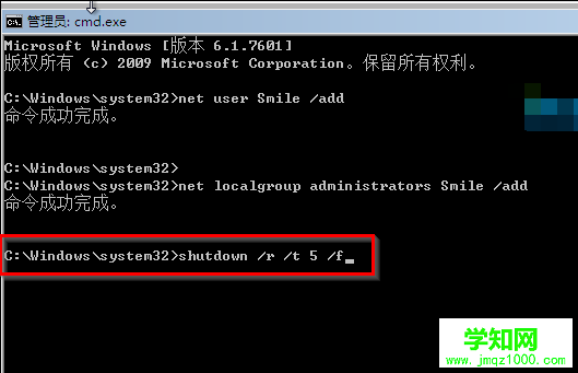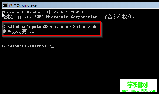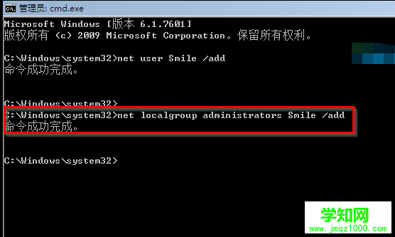 4、然后繼續輸入net localgroup administrators Smile /add (升級賬戶為管理員)
