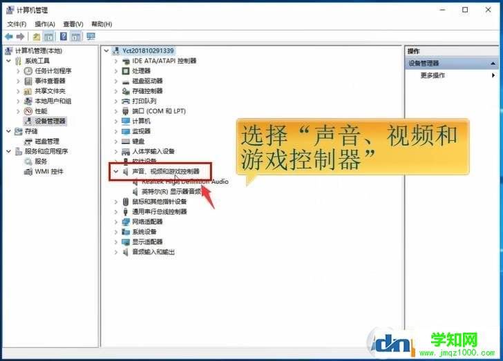 5、接下來點擊列表左邊“設(shè)備管理器”,在右邊選擇“聲音、視頻和游戲控制器”; 選擇聲音設(shè)備。
