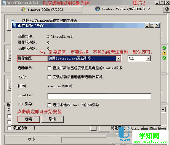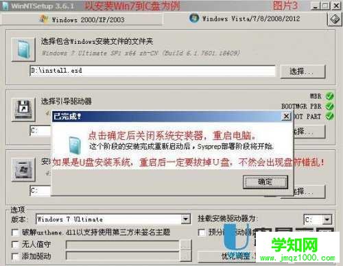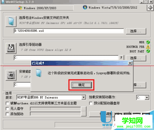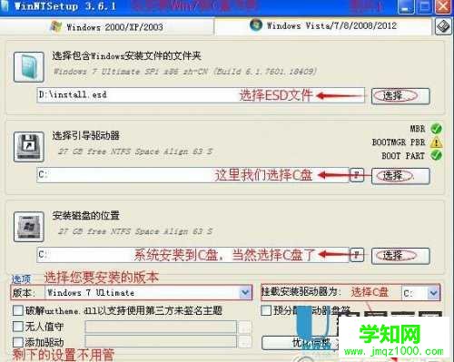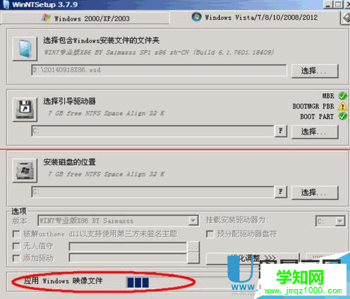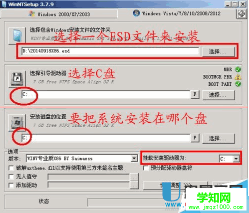 打開winntsetup,在 選擇包含windows安裝文件的文件夾 這里,點擊 選擇 找到你的ESD安裝文件. 選擇引導驅動器 默認為C盤, 安裝磁盤的位置 是指你要把系統安裝到哪個盤,比如C盤,或者D盤等.下面的 選項 一欄有一個 版本 ,是指的所要安裝的系統的版本,如果ESD文件中有多個版本的話,可以在這里進行選擇. 掛載安裝驅動器 默認為C盤.點擊 開始安裝 按鈕,準備安裝系統。
