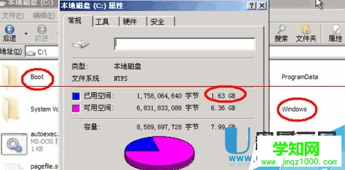 解壓縮完成后,我們看看C盤中已經有了boot,windows等文件夾,解壓出來的文件大小為1.63GB。