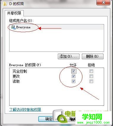給everyone 用戶設(shè)置權(quán)限如圖配置即可 點(diǎn)擊“確定”出現(xiàn)下