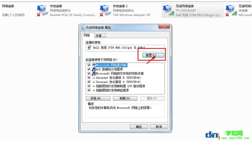 5:在彈出的:無線網絡連接 屬性窗口,鼠標單擊:配置;