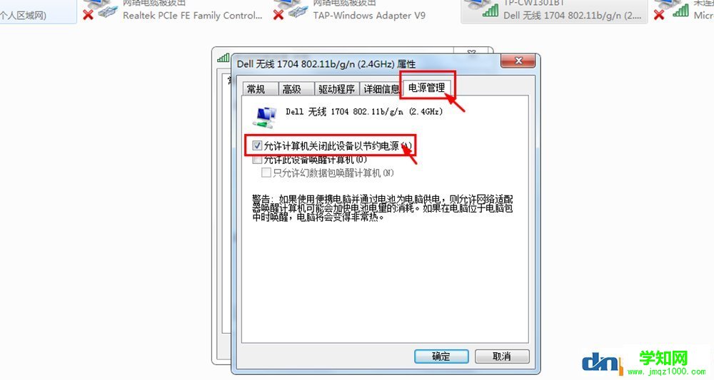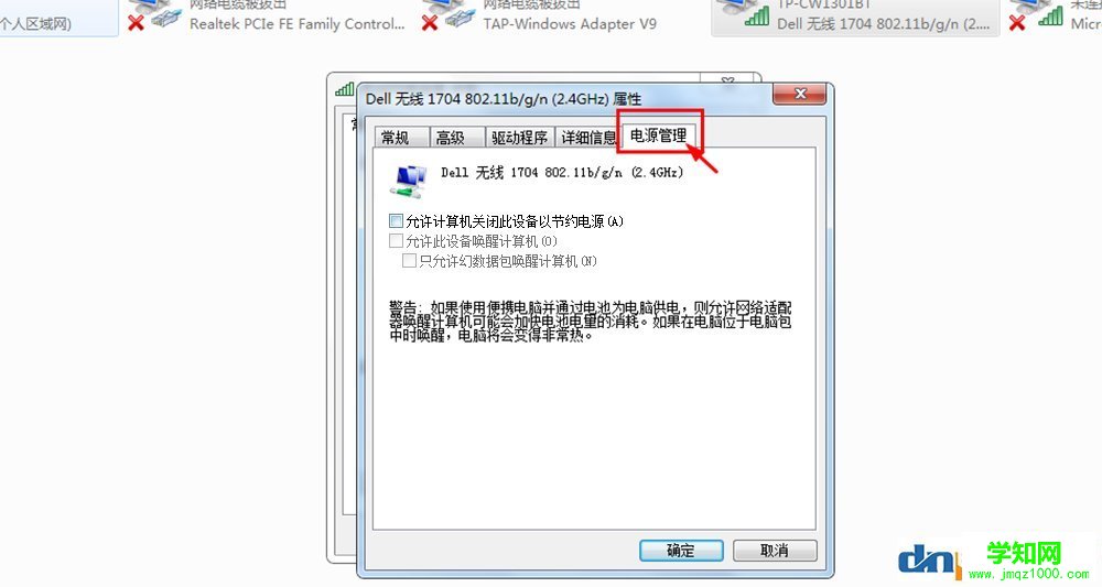 6:我們在彈出的:網絡鏈接屬性窗口,鼠標單擊:電源管理;