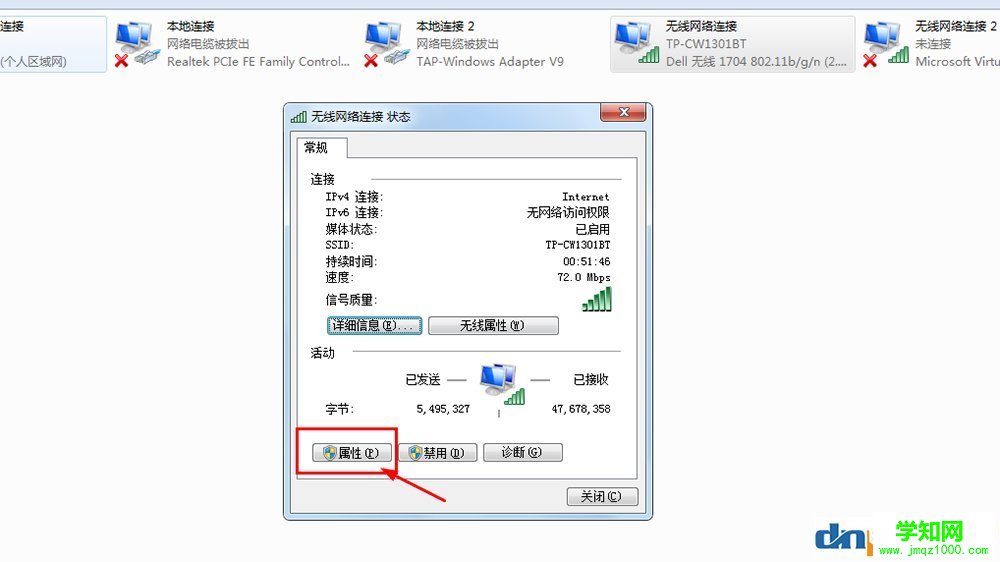 4: 彈出:無線網絡連接 狀態窗口,鼠標點擊:屬性;
