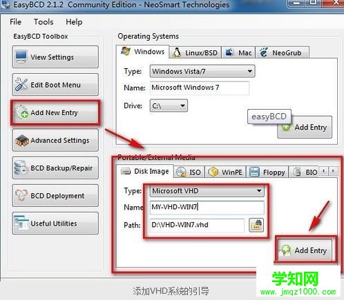 3、用EasyBCD把VHD-Win7.vhd寫入啟動項,安裝好easyBCD,按下圖操作: