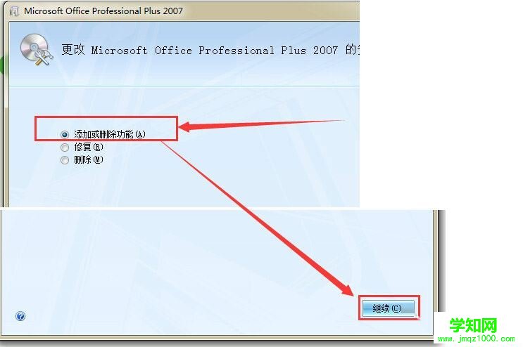 那么這里你需要勾選【添加或者刪除功能】--->【繼續】