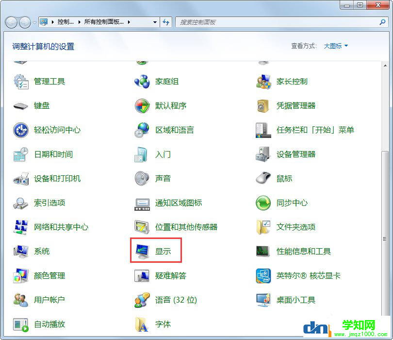 2、找到控制面板中“顯示”圖標,并雙擊該圖標;