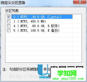 (5)、因為啟動Win10(D盤)時,要保護Win7(C盤)的文件不被破壞,所以,這里要選擇 啟動時更改分區顯隱狀態 ,并定義C盤(0磁盤、0分區)為隱藏狀態。